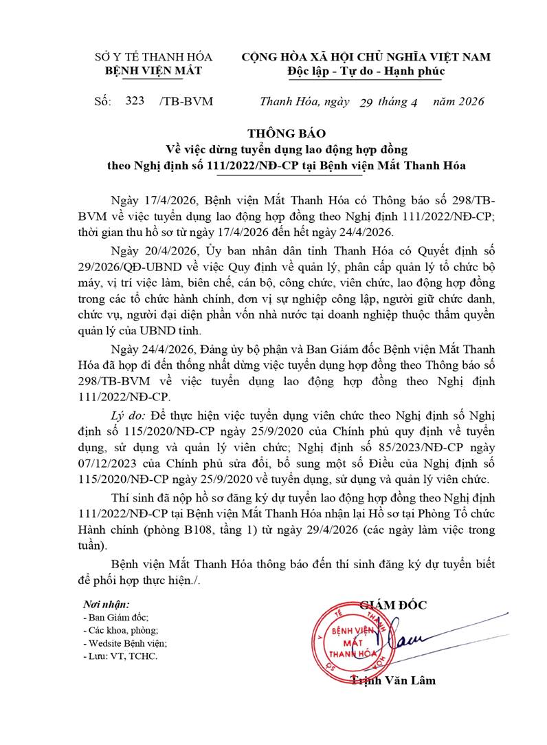 - Thông báo về việc dừng tuyển dụng lao động hợp đồng theo Nghị định số 111/2022/NĐ-CP