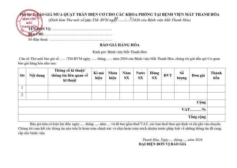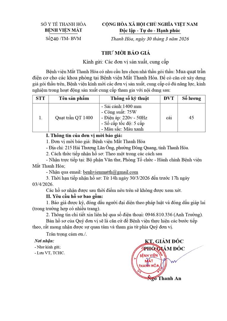 - Yêu cầu báo giá cho gói thầu kiểm định thiết bị y tế bệnh viện Mắt Thanh Hoá năm 2026