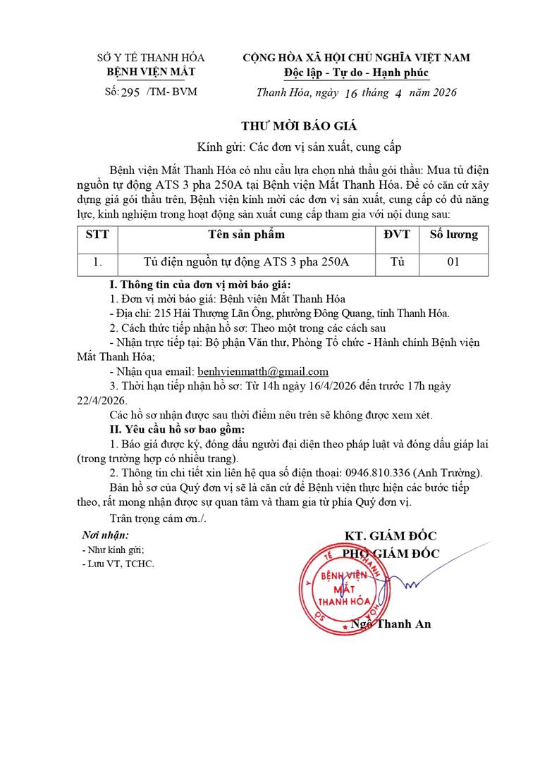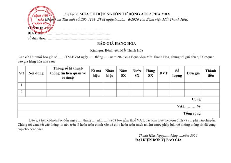 - Thư mời báo giá cho gói thầu mua tủ điện nguồn tự động ATS 3 pha 250A