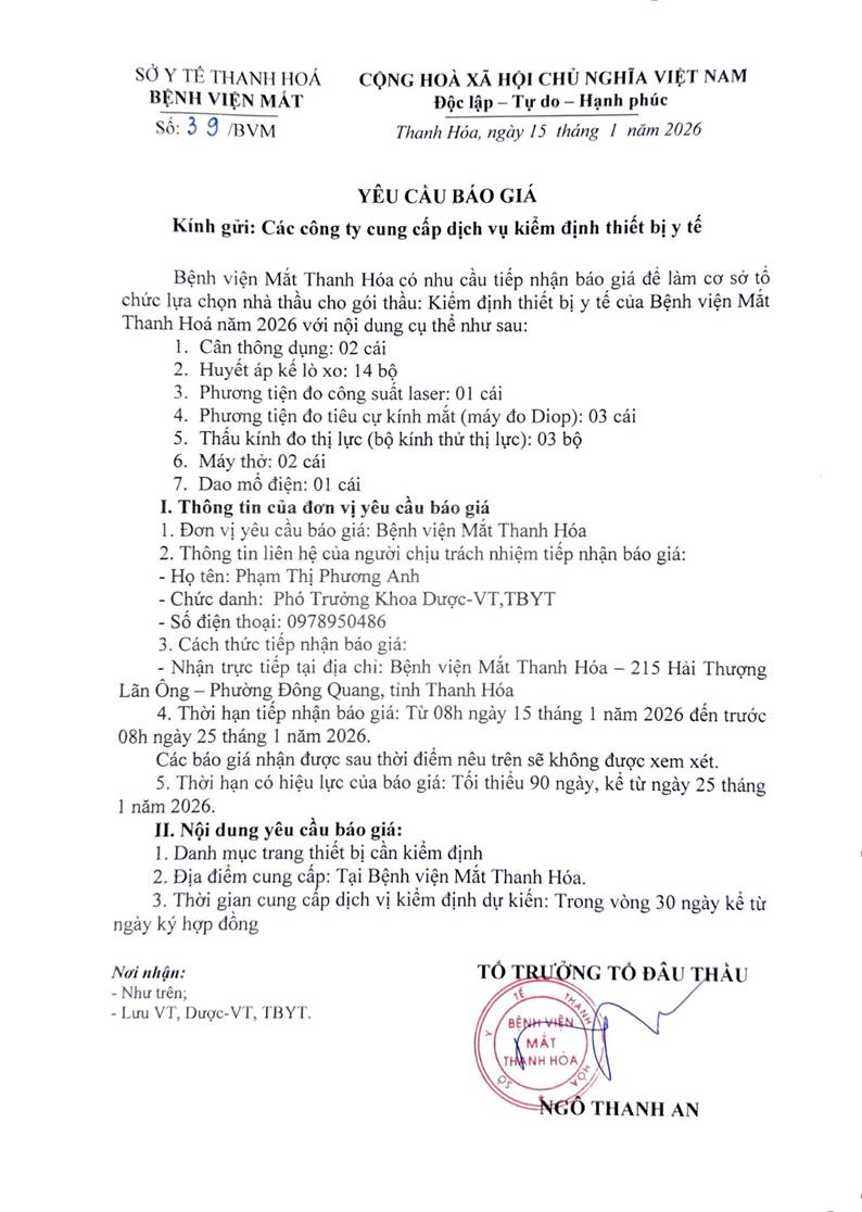 - Yêu cầu báo giá cho gói thầu kiểm định thiết bị y tế bệnh viện Mắt Thanh Hoá năm 2026