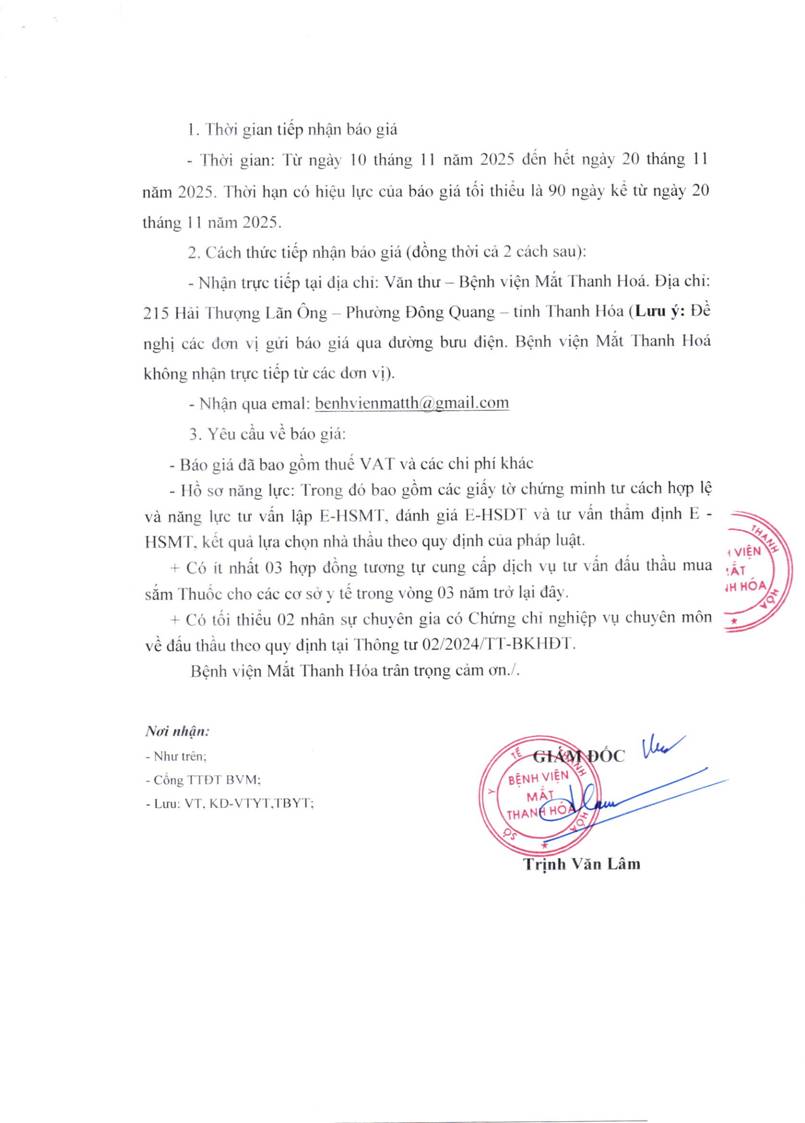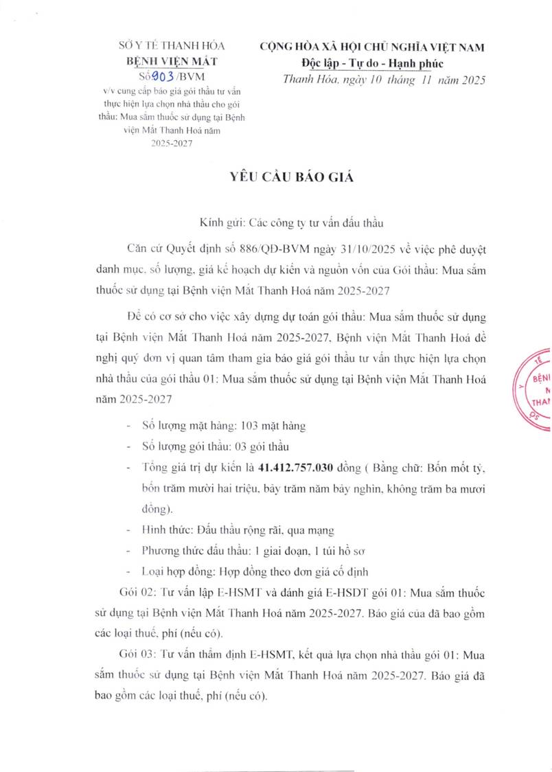 - Yêu cầu báo giá cho gói thầu Mua sắm thuốc sử dụng tại Bệnh viện Mắt Thanh Hoá năm 2025-2027
