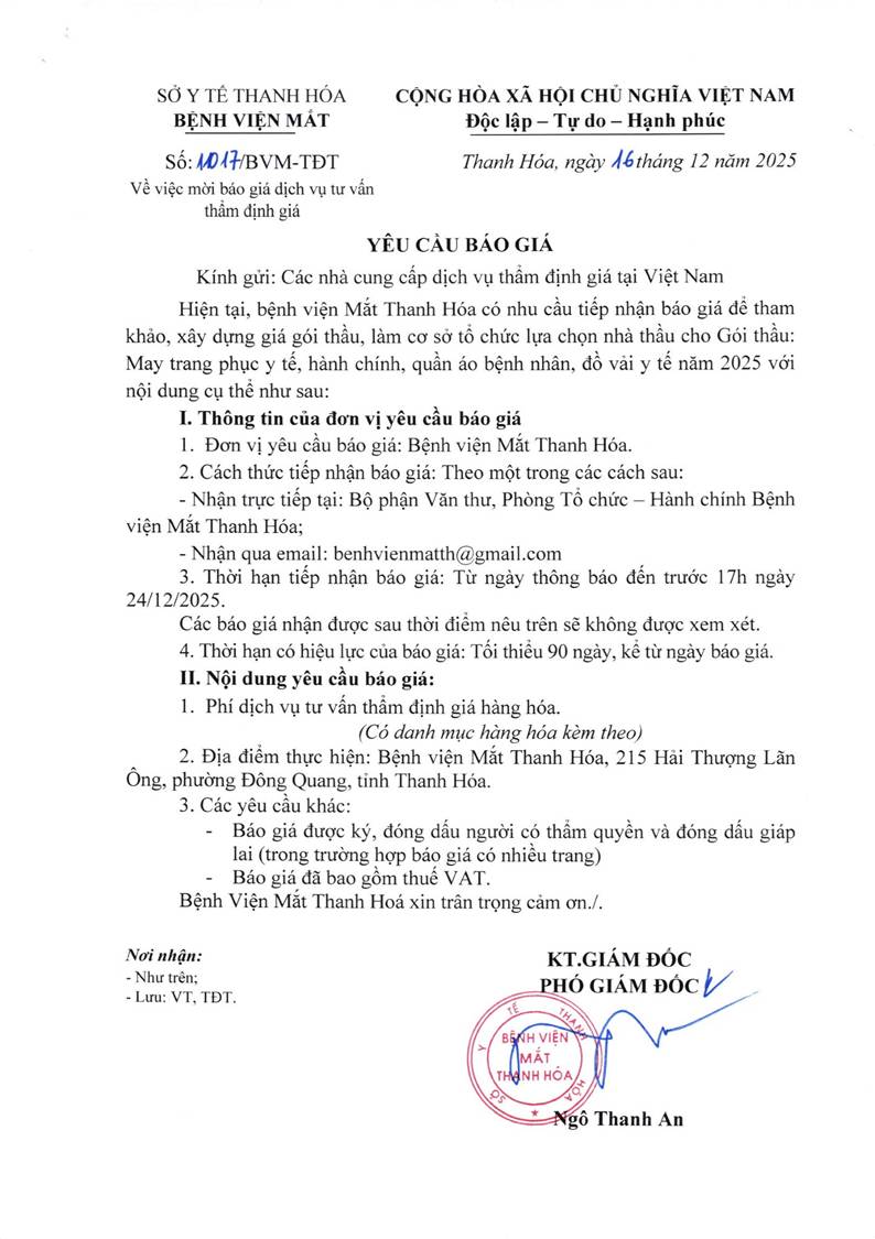 - Yêu cầu báo giá cho gói thầu Mua sắm thuốc sử dụng tại Bệnh viện Mắt Thanh Hoá năm 2025-2027